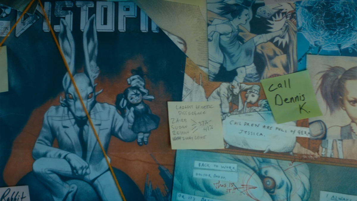 Another little courtesy is paid at around 04:30 in the remake’s second episode. A gang of comic book fans who’ve been speaking online for months meet up in person at a Chicago convention. They start drinking, and retire to the nearby home of one of their members, paranoid fringe culture survivalist Wilson Wilson (played by Desmin Borges). Naturally, he invites them down to his nuclear bunker and shows them an evidence wall packed with research on the comic book conspiracy that brought them together. Along with newspaper clippings and pages from the comic book in question, Dystopia, is a handwritten Post-It reminding Wilson to ‘Call Dennis K’, a tribute to UK screenwriter Dennis Kelly.